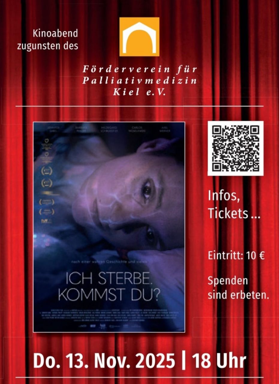 Am Donnerstag, den 13. November 2025 findet im Metrokino ein Kinoabend zugunsten des Fördervereins für Palliativmedizin Kiel e.V. statt. Ab 18:00 Uhr wird der Film „Ich sterbe. Kommst du?“ gezeigt. Karten sind jetzt über folgenden Link verfügbar: https://metrokino-kiel.de/.