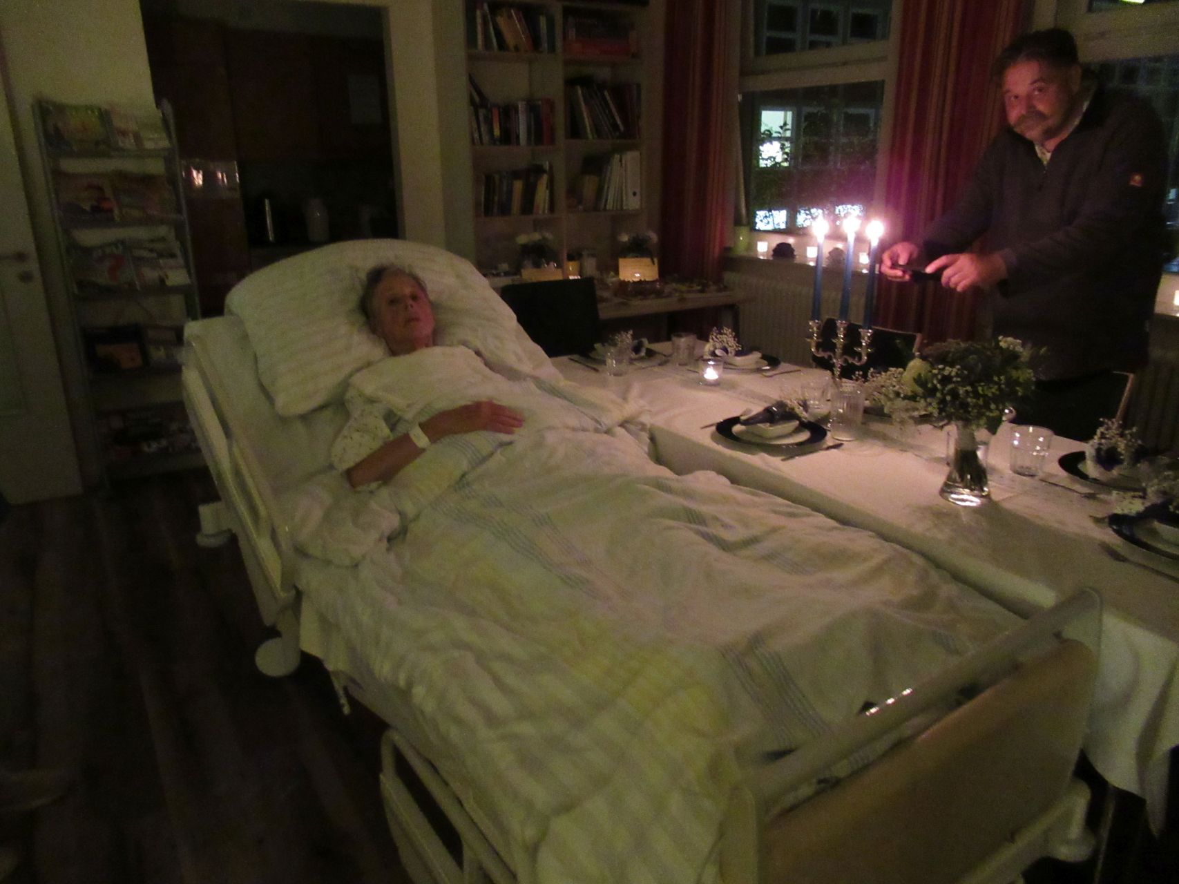 Zu der Ausgestaltung eines gemeinsamen Essens von Häppchen und Schnittchen hatte unsere Patientin besonders bei der Tischdekoration sehr genaue Vorstellungen, die ihre Vorlieben und Gewohnheiten wiederspiegeln sollten: wie ein Candle-Light-Dinner sollte es sein….. Obwohl unsere Patientin im Bett an die gemeinsame Tafel im geschmückten Raum geschoben werden musste, haben sie und ihre Angehörigen sich sehr über die Details gefreut und einen innigen Abend miteinander verbracht.