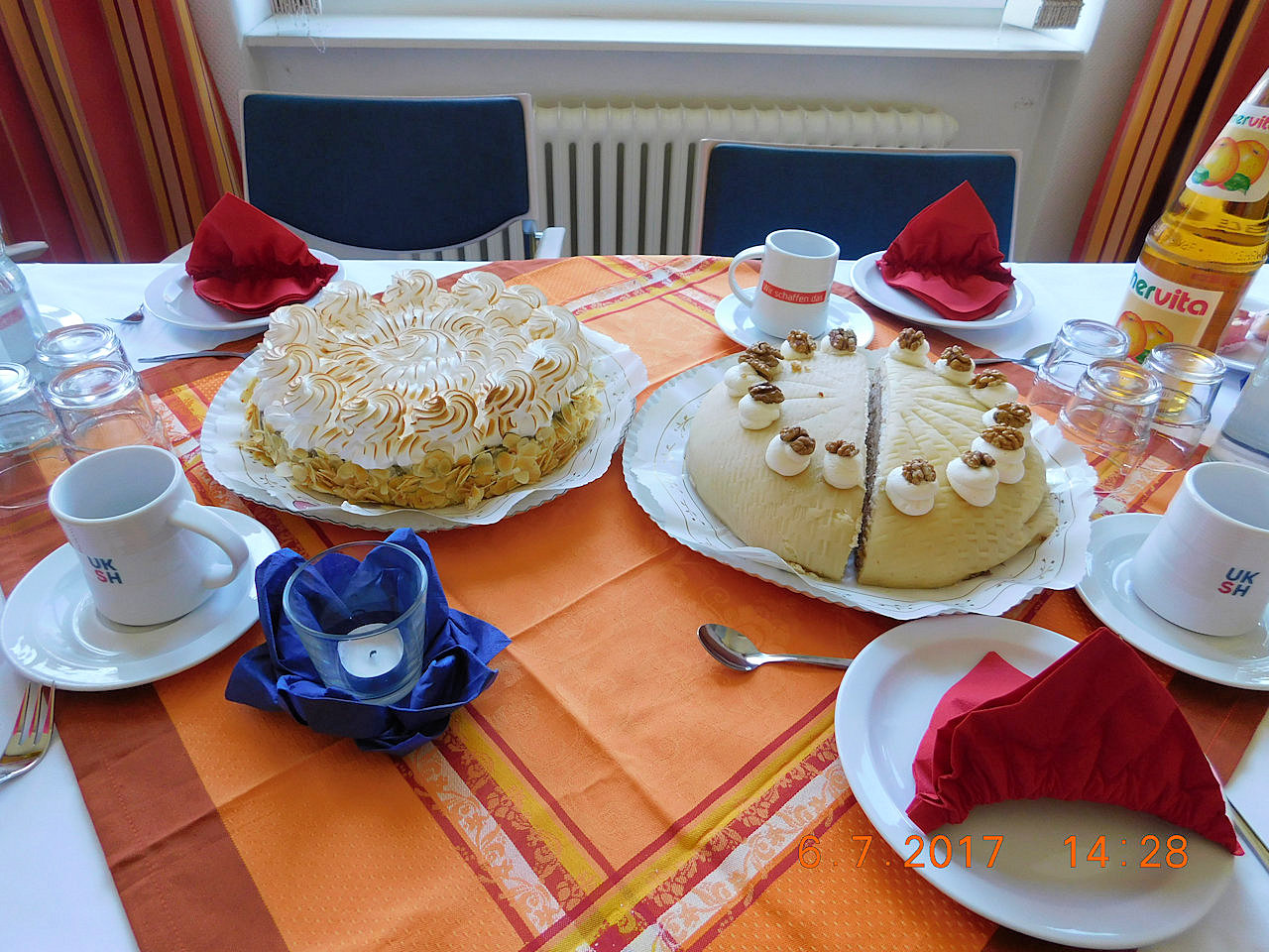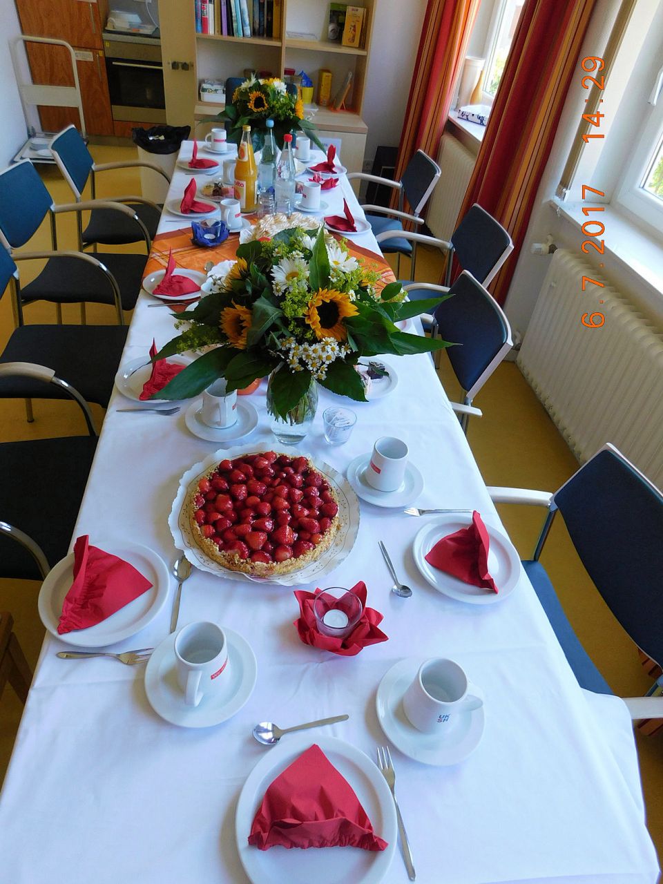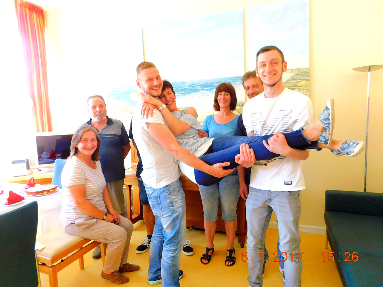 Frau G. und Ihre Tochter, erzählten in einem persönlichen Gespräch auf der Schmerz- und Palliativstation, dass Frau G. gern den 50. Geburtstag Ihrer Tochter feiern möchte. Da kam uns die Idee, dass wir den Geburtstag der Tochter bei uns auf Station ausrichten könnten. Der Plan stand und somit starteten wir, das Projektteam WunderVoll, die Planung. Wir arrangierten diverse Petite Fair, Torten und Blumen, welche auf Station geliefert wurden und richteten unser "Stationswohnzimmer" schön für eine Feier her. Im Laufe des Nachmittages kamen immer mehr Gäste. Frau G. die bettlägerig ist, wurde mit dem Bett in das Wohnzimmer geschoben und freute sich über die Gäste und die hergerichtete Geburtstagstafel. Frau G. hatte nun Appetit auf ein großes Stück Erdbeer-Vanille Torte, welches sie im Handumdrehen verzehrte. Die gesamte Familie, war sehr glücklich und zufrieden, diesen Tag gemeinsam mit Frau G. zu verbringen. Da Frau G. nicht fotografiert werden wollte, stellte sich ihre Gäste gern zur Verfügung, wodurch ein schönes Erinnerungsfoto entstanden ist!