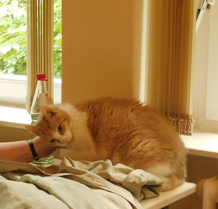 Nach einer kleinen Eingewöhnungsphase legte sich Leo auf das Bett von Herrn M. und ließ sich von ihm streicheln. Endlich hatte er seinen Kater wieder bei sich! Nach mehreren Stunden Gemeinsamkeit mussten sich die Beiden leider wieder trennen.